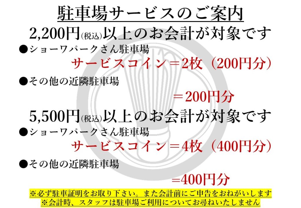 つきましては、【ご利用証明】をご提示いただいた方には当店規約に従い、駐車場サービスをさせていただきます。大変ご面倒ではございますが、必ず【駐車場 ご利用証明】を会計時にご提示くださいませ。